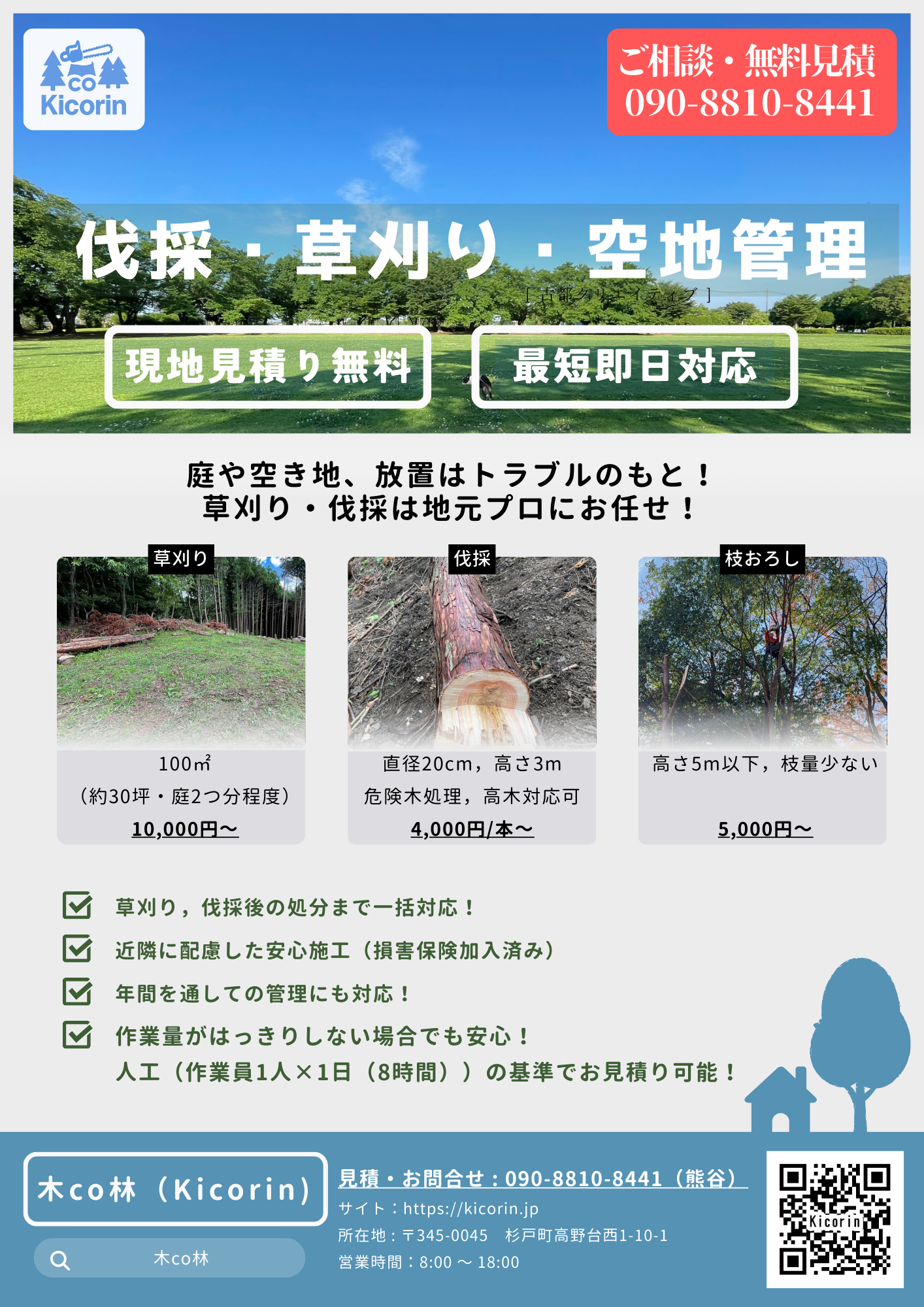 空地を放置すると、雑草や低木が伸びて景観が悪くなり、不法投棄や害虫の原因に…。木CO林(Kicorin)の伐採・草刈りで資産価値に良い影響を与え、周囲からも安心して見てもらえます。!詳しくは所有地(空き地を含む)の適正な維持管理についてをご覧ください。